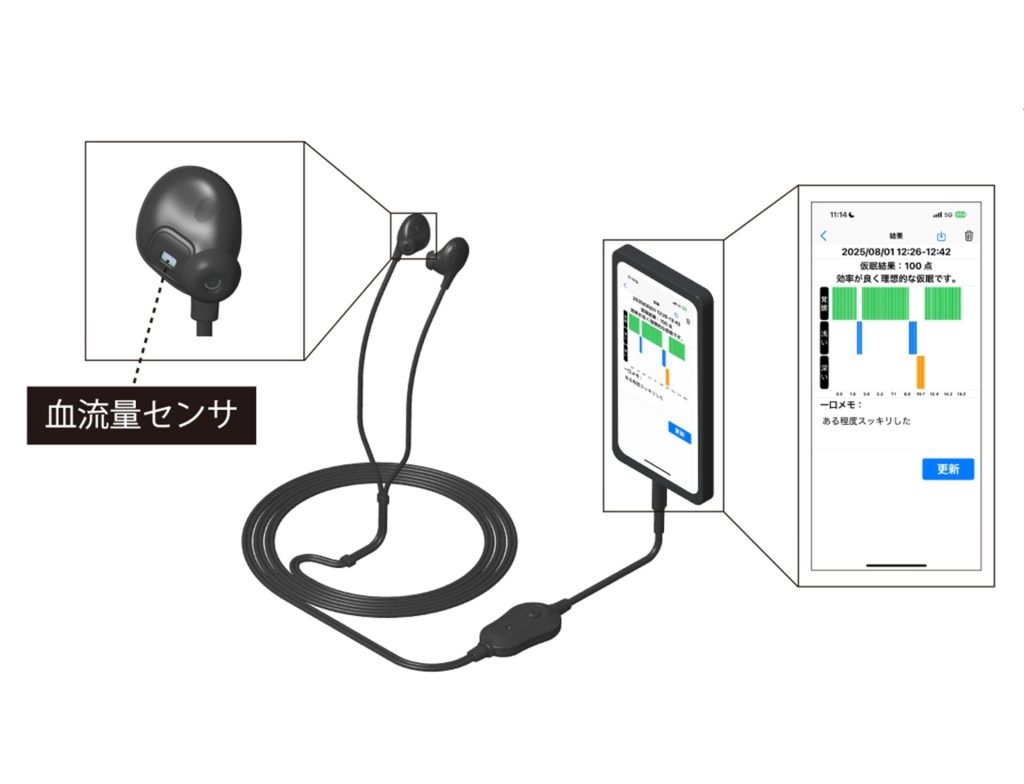 「sNAPout®」は血流量センサを搭載したイヤホンデバイスと、AIを搭載したスマートフォンアプリで構成される仮眠起床システムです。入眠の際は、左右の耳に異なる周波数を流す深睡眠促進音で深い眠りを促します。入眠後は、スマートフォンアプリに内蔵されたAIが血流量データにより高精度かつリアルタイムで睡眠状態を解析。最適なタイミングでアラームを鳴らし仮眠からの起床を誘導します。